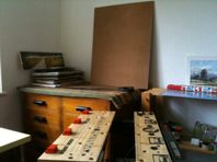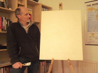 | Step 1: cut a piece of hardboard to the right size... ...paint it with emulsion, sandpaper it and repeat that process a few times. Then pose for a photo. This is probably the best this painting is ever going to look! | ||