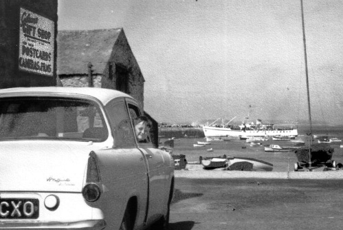 I don't seem to have a photograph of Gibson's Gift Shop, which is perhaps appropriate given that the poem I am writing about it focuses on the uncertain boundary between memory and imagination. The best I have is a photograph that includes an advertisement board for "Gibson's Gift Shop - Postcards, cameras, films". That's me looking out of Tommy Cock's car, with the old Scillonian in the background, in the mid-1960s. |