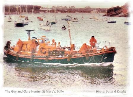The Guy and Clare Hunter The Watson class 'Guy and Clare Hunter' was the Isles of Scilly lifeboat from 1955-1981. When I was small I met many of the crew and heard stories of some of their famous rescues. I remember seeing them setting off for, and returning from, some of those missions. In those days the crew were called by the sounding of maroons and the boat launched down the slipway from the lifeboat house that is just visible in the background of the photograph below. I am not sure exactly when I took this particular photo, but I think it was during the Fastnet rescues of August 1979. I think the figure on the Bow is Richard Lethbridge, and the Coxswain at that time was his brother Matt Lethbridge, hence the reference in the poem.